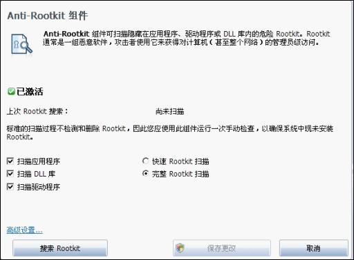 用戶安裝的應用程序或者驅動程序中如果含有Rootkit,點擊搜索Rootkit, AVG就可以檢查出用戶電腦是否已經被黑客控制。早在2007年AVG就已經推出了一款名為AVG Anti-Rootkit的Rootkit檢測和清除工具。