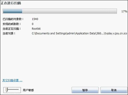 圖為AVG正在掃描Rootkit,AVG掃描速度分為用戶敏感、低優先級、中優先級和高優先級四種,用戶敏感級別的掃描速度會隨著資源使用情況而變化,建議采用此項。