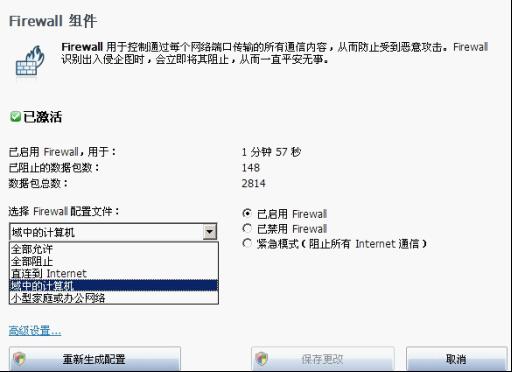 AVG2012的防火墻功能用于控 制通過每個網絡端口的所有通信內容,也就是說用戶瀏覽互聯網時所發生的一切接受行為,其內容都會經過AVG防火墻的控制,以確定其是否含有惡意攻擊,如果 有惡意攻擊,防火墻會自動將其攔下。AVG2012中設置了三種防火墻模式,以及五種防火墻配置文件,用戶可根據不同需求來設置。