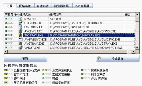 AVG2012中的系統工具,為我們提供了完善的系統進程查看器,點擊進程之后,下方會出現次進程的詳細信息,方便用戶確定此進程是否被終止。系統工具中還可以查看網絡連接、隨機啟動項、瀏覽器擴展的插件、LSP等等。