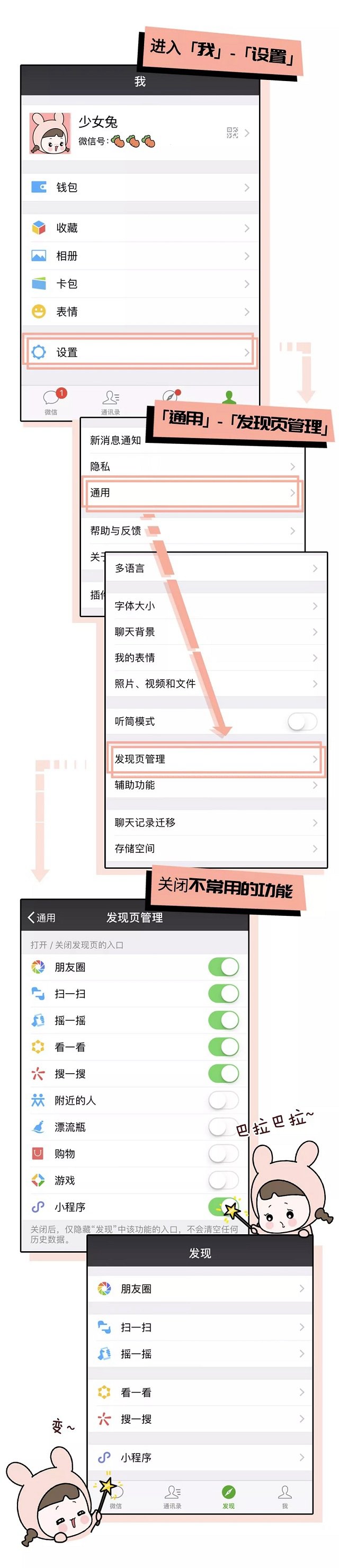 如果覺(jué)得“發(fā)現(xiàn)”頁(yè)面功能太臃腫,看起來(lái)不簡(jiǎn)潔的話,我們還可以對(duì)發(fā)現(xiàn)進(jìn)行瘦身,具體操作如下。