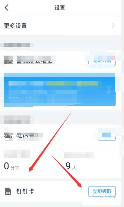 第三:進入設置中心找到下方的【釘釘卡】選項點擊右側的【領取】按鈕。