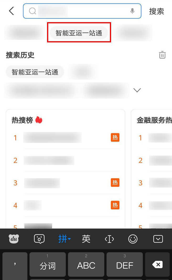 1、打開支付寶,進入支付寶首頁,點擊上方搜索框,輸入智能亞運一站通,點擊搜索;