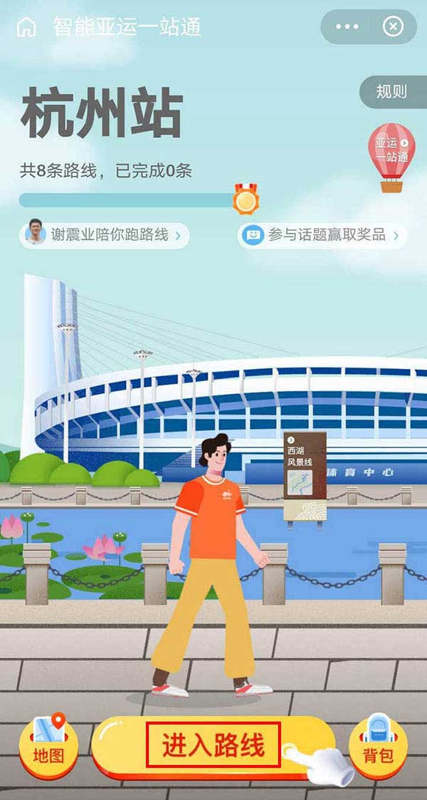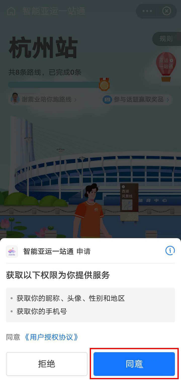 3、接著進入小程序頁面,第一站是杭州站,點擊進入路線,頁面下方彈窗顯示權限授權頁面,閱讀一下協議,點擊同意;