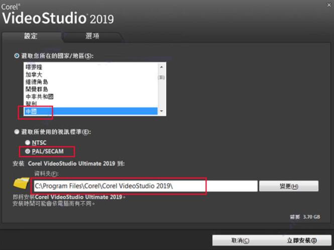 5、設置選擇中國,標準為pal/secam,默認安裝目錄【C:\Program Files\Corel\Corel VideoStudio 2019\】
