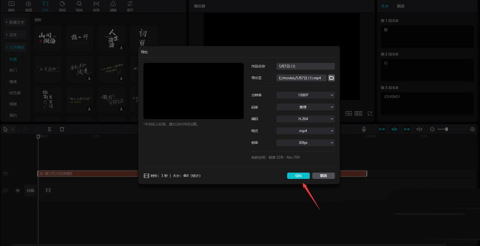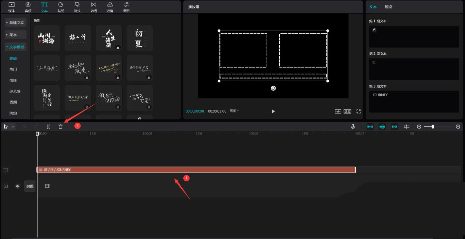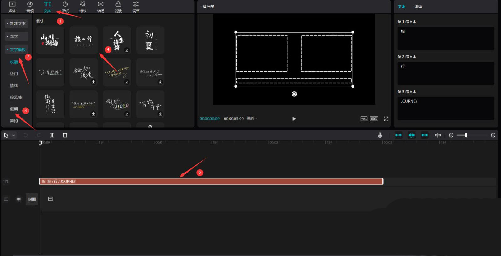 點擊文本按鈕,然后點擊文字模板按鈕,選擇假期中的一個模板,將其添加到文本軌道中,見下圖。
