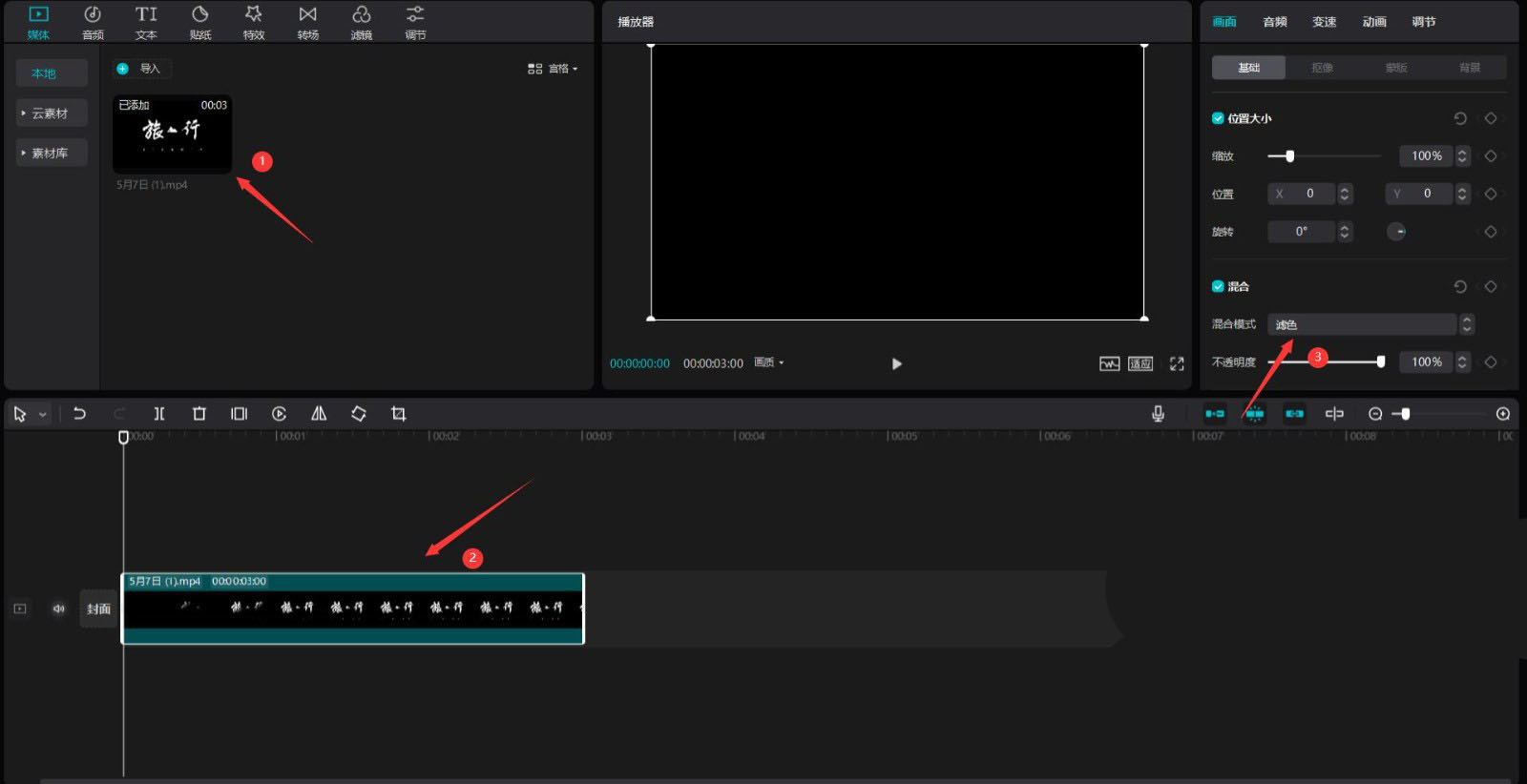 選中導(dǎo)入的視頻,將其添加到視頻軌道中,然后更改混合模式為濾色,見下圖。
