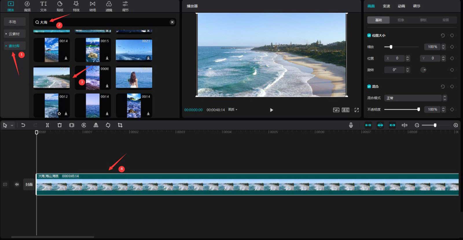 點擊素材庫按鈕,在搜索欄中輸入大海兩字,選擇一段視頻素材,將其添加到視頻軌道中,見下圖。