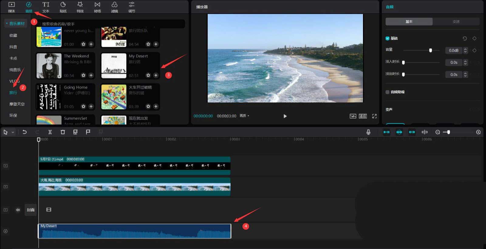 點擊音頻按鈕,選擇旅行中的一段音樂,將其添加到音頻軌道中然后調(diào)整音頻的結(jié)尾和其他素材的結(jié)尾對齊,見下圖。