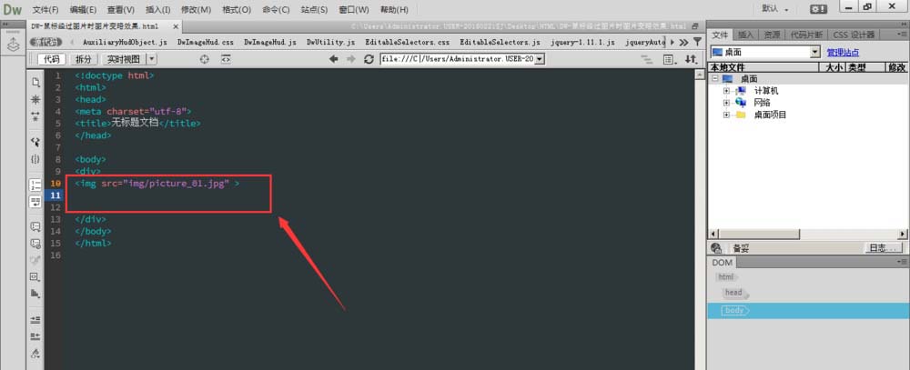 2、在body建立div標簽,在div中插入一張圖片,如下圖所示