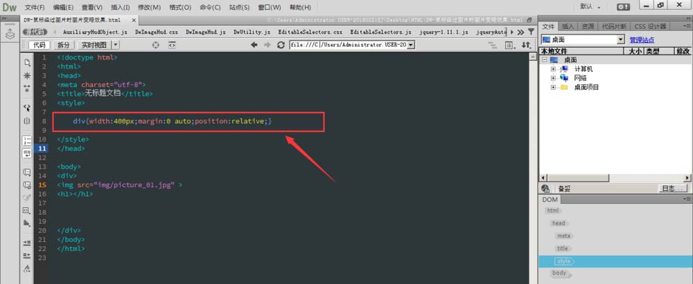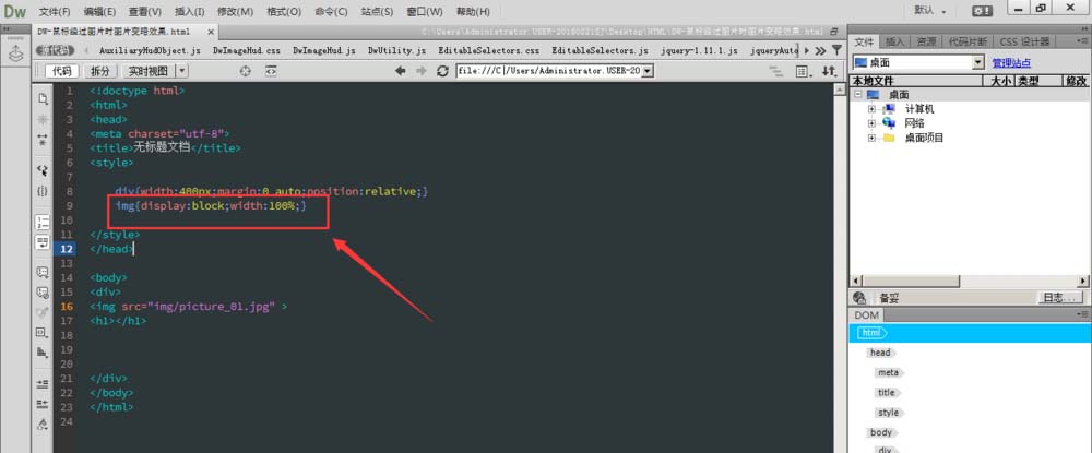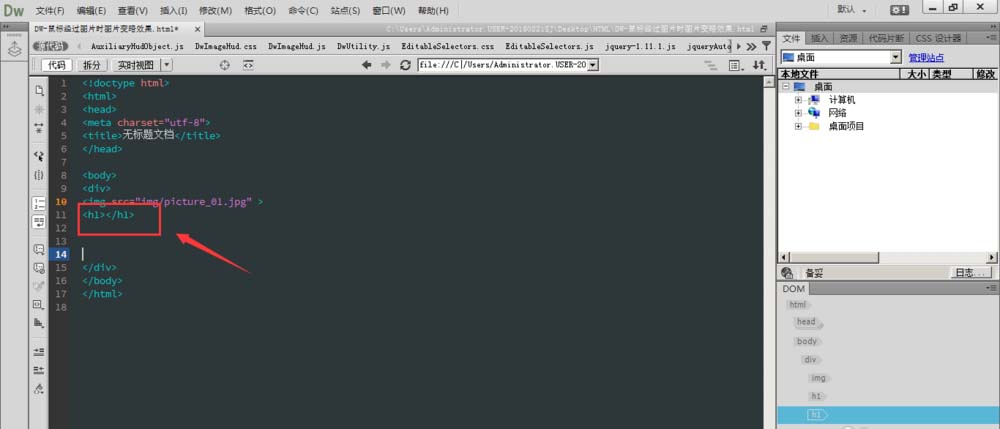3、在div再建立一個塊狀標簽,新建立的h1和img是同級,都是div的子集,