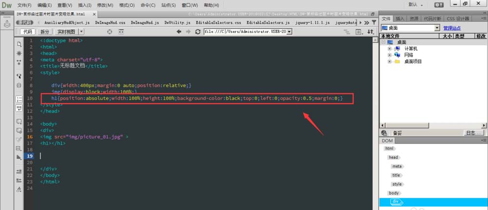 6、然后對h1進行設置,將h1覆蓋在圖片上方,寬度和高度都設置為100%,調整不透明度,相對定位:margin:0;去掉h1本身帶有的屬性